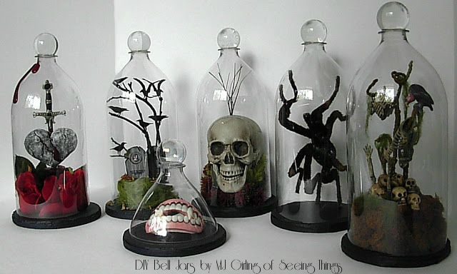 DIY Soda Bell Jars by MJ Girling of Seeing ThingsThese found items, while rarely scary on their own, effectively create a lovely spooky aesthetic when a few creepy items are added to the collection. For this, I rely on DIY to inexpensively round out my decor and turn a home into a fabulously eerie haunted house.  Naturally, then, I was beyond excited to find this DIY Apothocary Table scene from M. J. Girling at Seeing Things that Aren’t Really There. Elegant and creepy, this Halloween scene is bristling with oddities from long ago; poison bottles, specimen jars, anatomical drawings studied by flickering candlelight. Best of all, she has included exceptionally easy DIY tutorials for the display, from creating altered books and weathered apothecary bottles to drippy candles and soda bottle bell jars! Click on over and get inspired, darlings. Happy haunting!