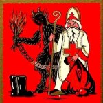 Despite periodic condemnation in the middle ages and more recently in the early 20th century, the Krampus merged with Catholic traditions of veneration of saints in the 1600’s, pairing up with Saint Nicholas to become a staple of holiday celebrations across European countries from Germany and Austria south and east to Croatia. While Saint Nicholas is a kindly (if austere) figure bearing gifts for good children, the Krampus is his devilish companion, responsible for the punishment of naughty children, binding them with chains or stuffing them in baskets, occasionally dragging the naughtiest away to be drowned or eaten.