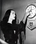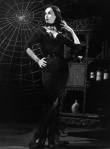 It was not until six years later that Maila achieved her big break. At a Hollywood masquerade party in 1953, Maila appeared in pale makeup with a tight, black dress hugging her carefully constructed figure, drawing costume inspiration from the limpidly gothic character later known as Morticia Addams. Regularly appearing in The New Yorker since the 1930’s as the matriarch of Charles Addams’s gleefully macabre family,  Morticia was slim and dressed in black, “low-voiced, incisive and subtle…even in disposition, muted, witty, sometimes deadly.” That night, Maila’s spot-on characterization won the interest of Hunt Stromberg, Jr., a local television producer, and an offer for Maila to introduce scary movies once a week on KABC Los Angeles. With some adjustment to character and costume, The Vampira Show was born on April 30, 1954, starting each performance with Maila’s signature Vampira intro.